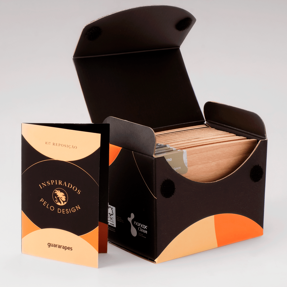 Caixa com amostras soltas de tamanho 9 x 13 cm, ideais para manusear. Use-as para montar moodboards, testar combinações, observar detalhes dos desenhos e sentir as texturas de cada padrão